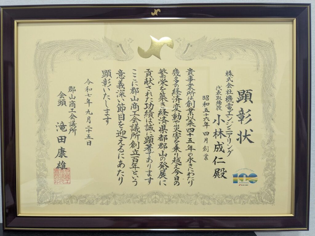 郡山商工会議所設立100周年記念事業にて「永年事業所顕彰状」を受領しました